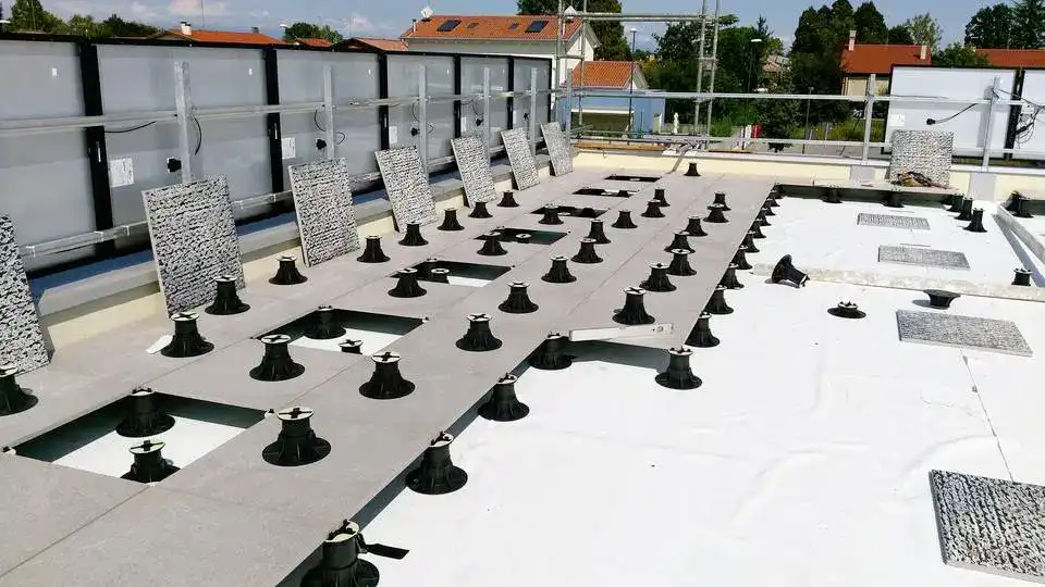 Adjustable SBPA pedestal support with tilting head is perfect for installing wooden decks. The support head with side supports makes it easy to adjust any structures. This type of pedestal, which automatically adapts to a slope of up to 5%, will allow the realization of terraces of various complexity.