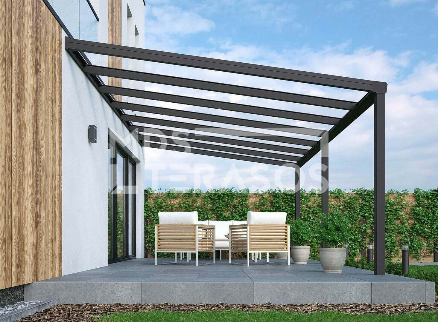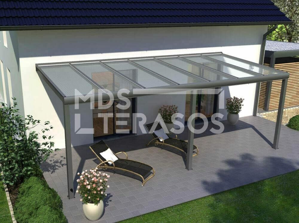 Aluminum terrace canopy with 16 mm channel polycarbonate covering. Strong and durable aluminum construction with integrated invisible rain gutter system. Quick, convenient and easy canopy assembly.